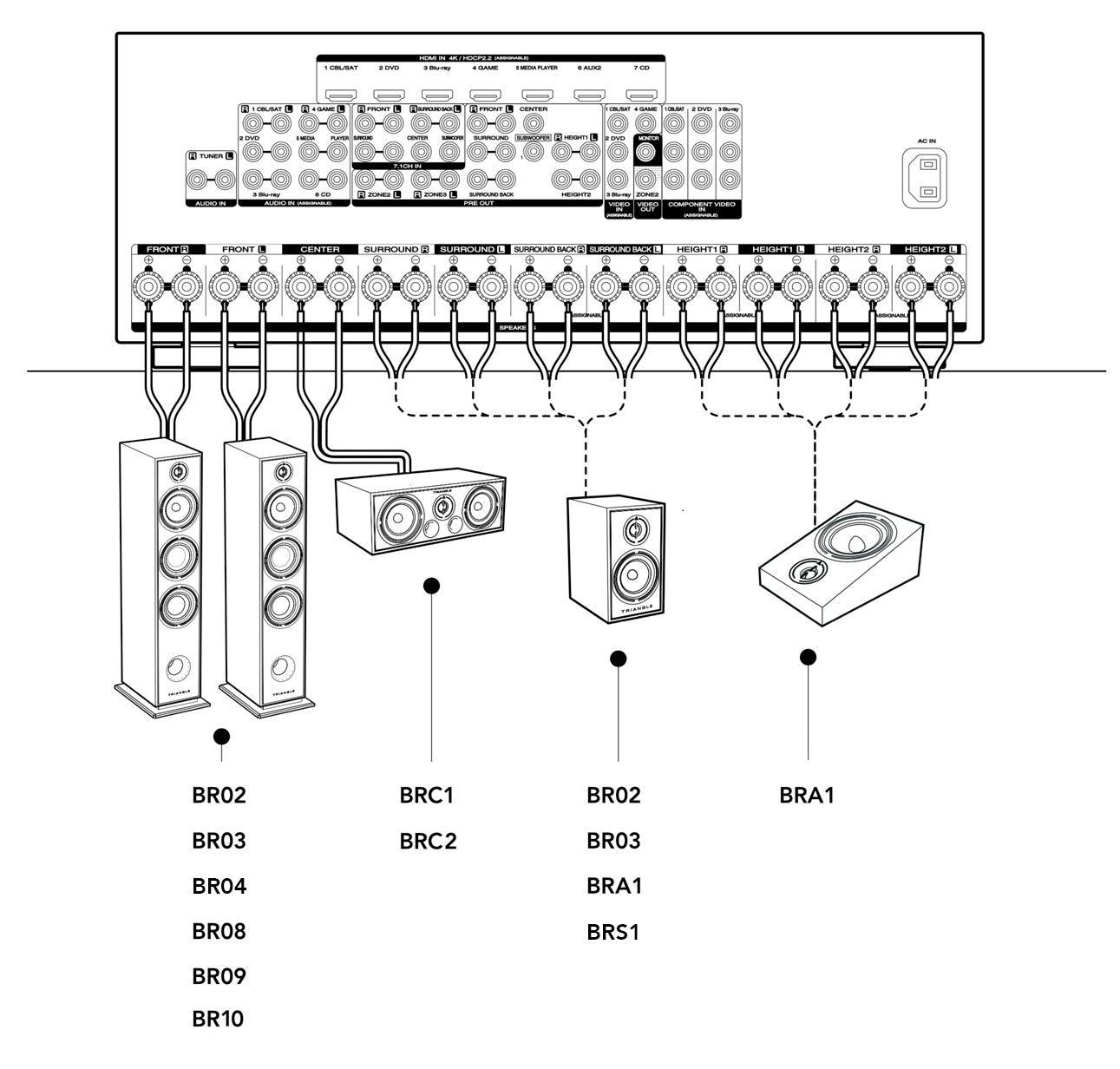 -Please refer to your amplifier manual for speaker connection and assignment according to their position in your room.