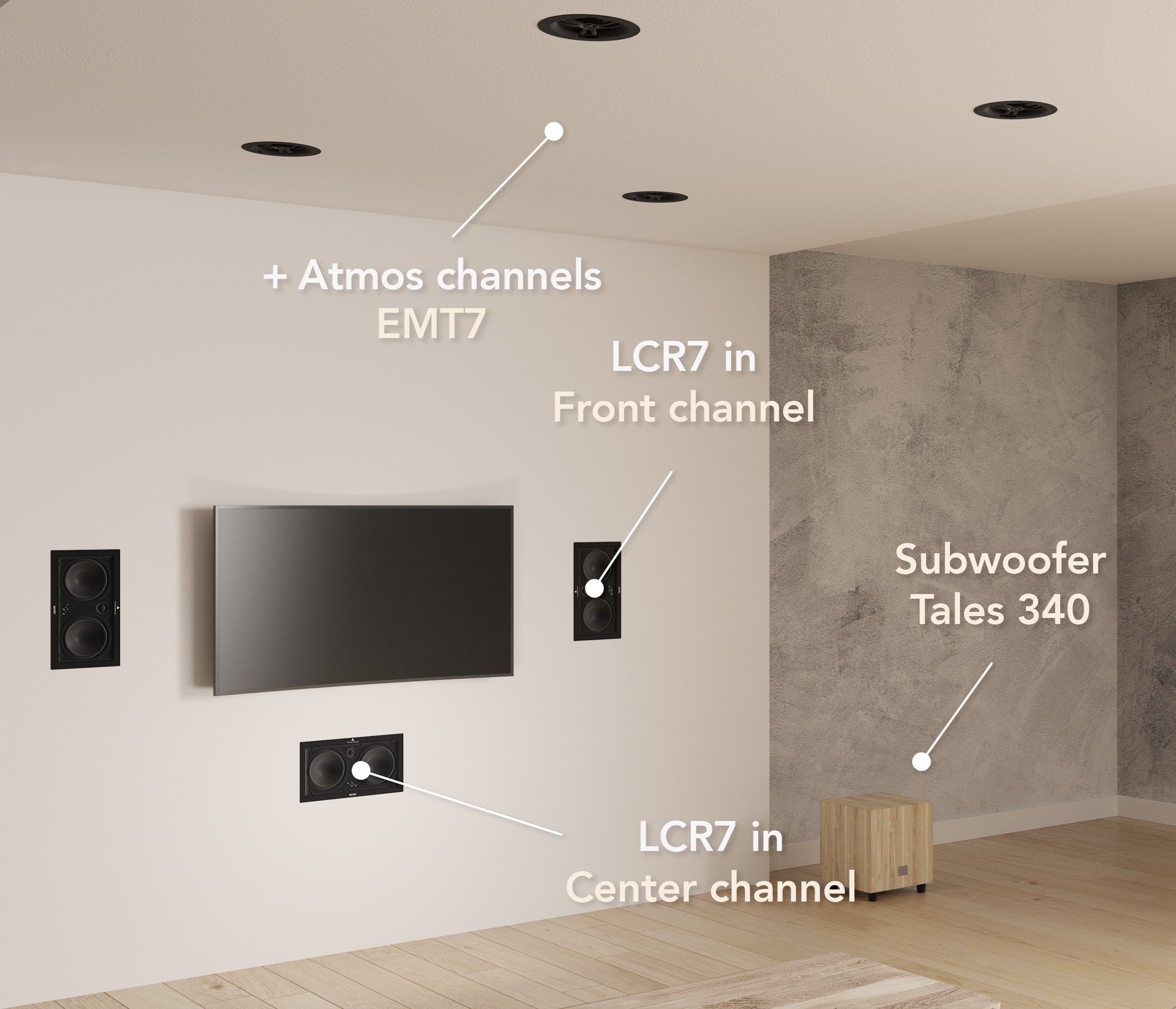 - Hybrid speakers: like the LCR7, which can be used as a center speaker or as a front or surround speaker. They can be flush-mounted in the wall.