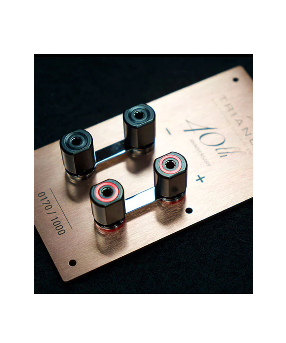 The terminals of the 40th Anniversary range are in rose gold anodized brushed aluminum. The custom-designed, insulated terminals can accommodate a 5mm diameter cross-section cable. They can also accommodate banana plugs with a locking system.