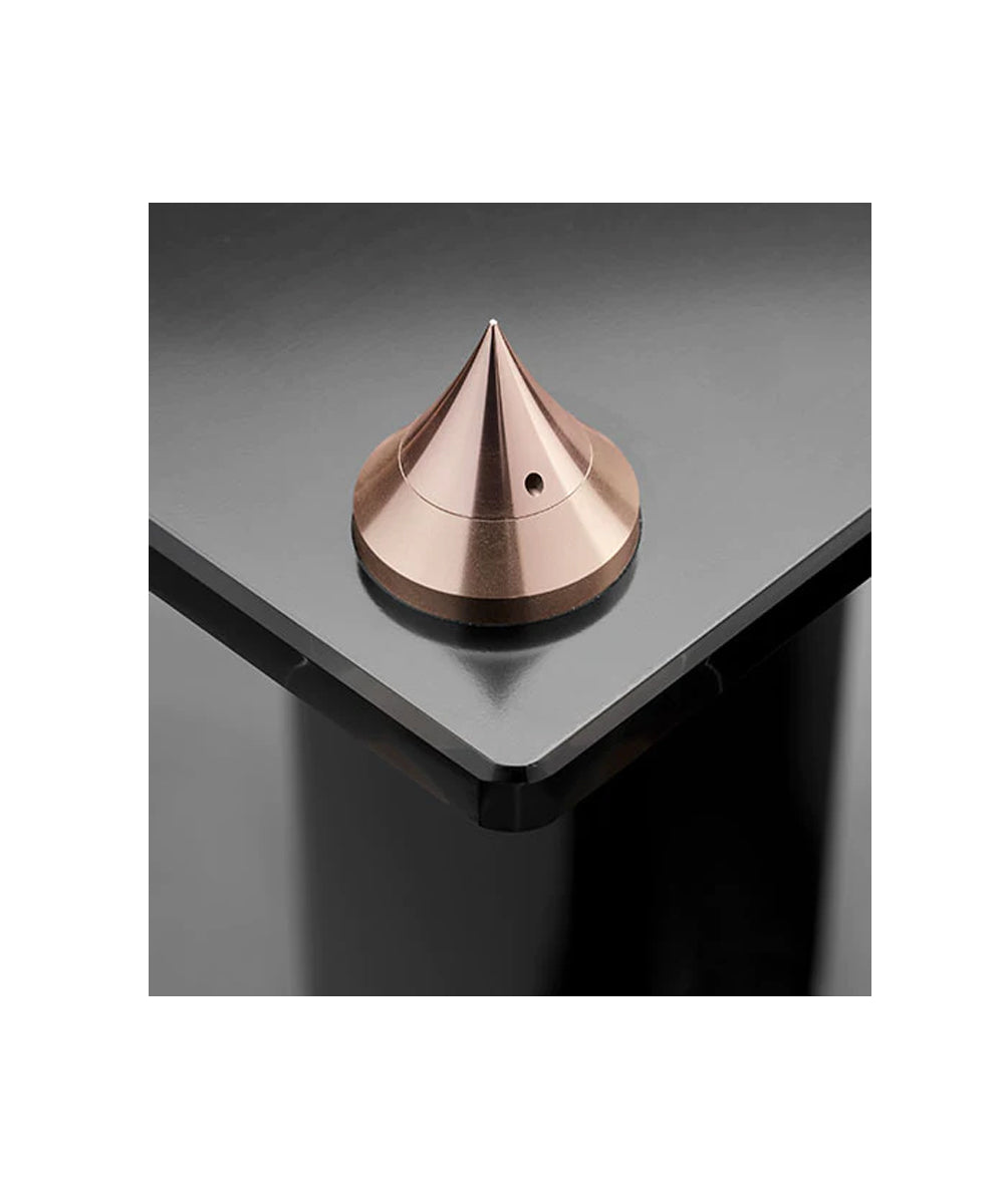 Two sets of decoupling spikes: the first one in rose gold aluminum, adjustable in height and provided with lock nuts for surfaces like carpets, and the second one in rubber for more rigid surfaces.