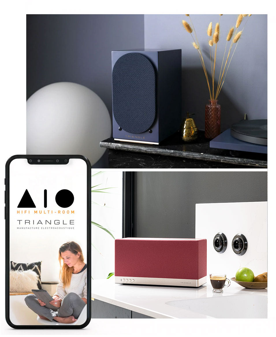 Access a wide choice of streaming services from your smartphone or tablet using the free “Triangle AIO” app, available on the App Store or Google Play Store. You can also access the music stored on your devices or your home network.