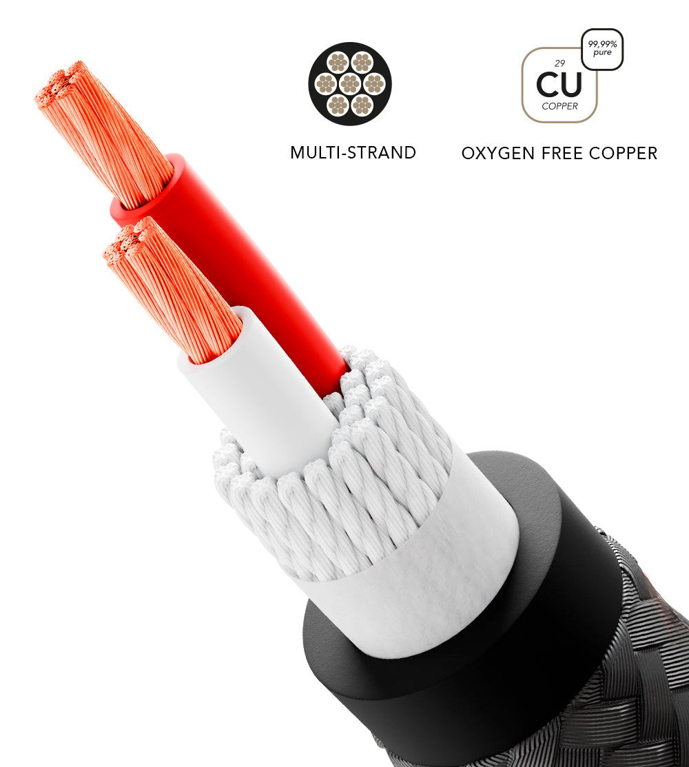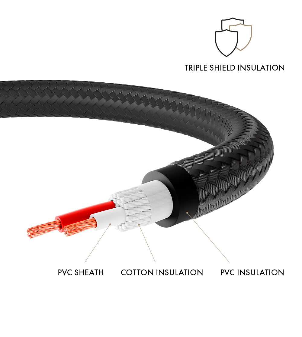 – An outer sheath made of braided fabric and PVC, which is both flexible and resistant, protecting the cable from interference.