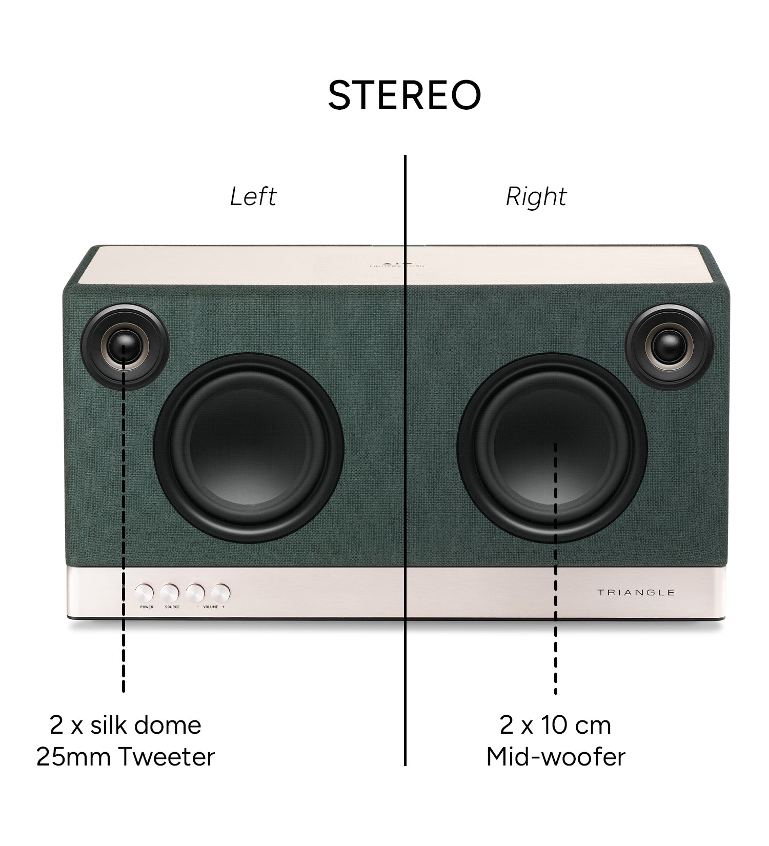 Divided into two parts to accurately reproduce the left and right channels, the speaker is equipped with 2 x 25mm fabric dome tweeters and 2 x 10 cm mid-bass drivers that will sound great in small to medium sized rooms, up to 25m2.